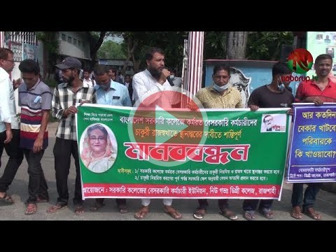 বাংলাদেশের সরকারি কলেজে কর্মরত বেসরকারি কর্মচারীদের চাকুরী নিয়মিত ও রাজস্বখাতে স্থানান্তরের দাবীতে রাজশাহীতে মানববন্ধন অনুষ্ঠিত হয়েছে।