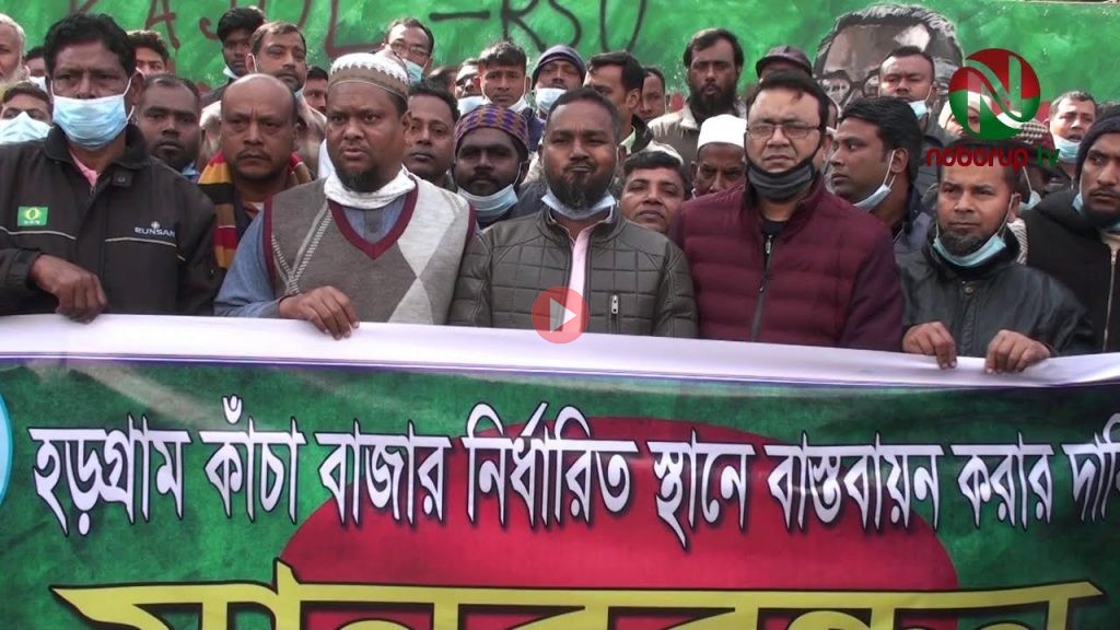 রাজশাহীর হড়গ্রাম কাঁচাবাজার নির্ধারিত স্থানে বাস্তবায়নের দাবীতে মানববন্ধন